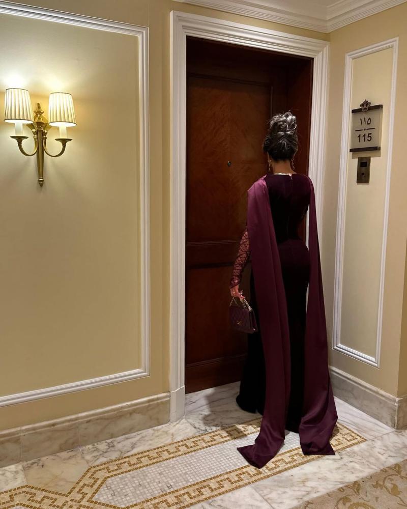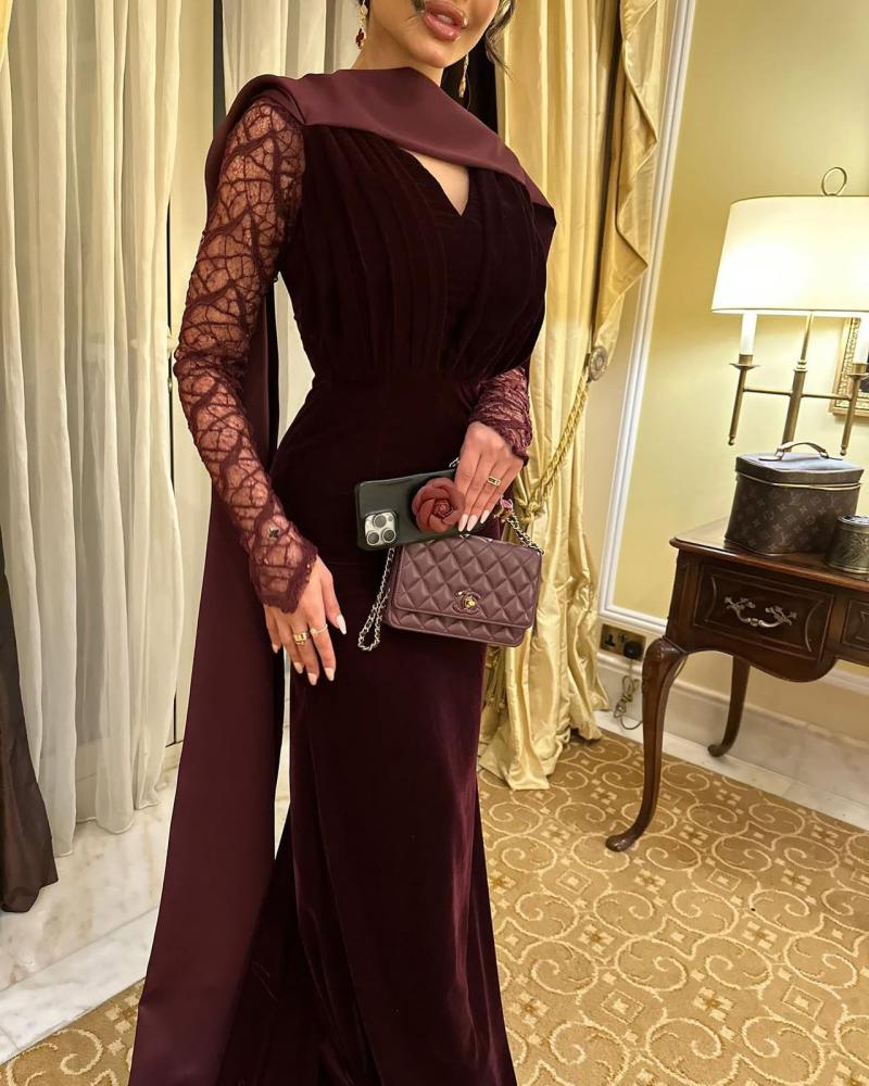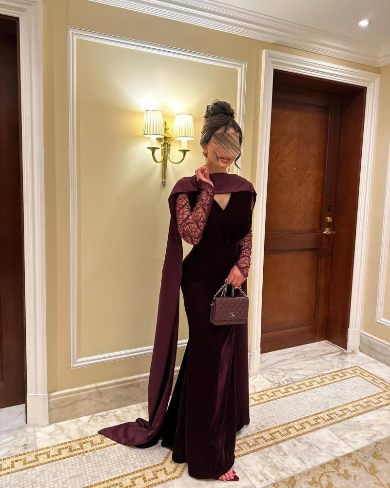فستان سهرة خامة جوخ دانتيل الاكمام تفته استرتش الشال