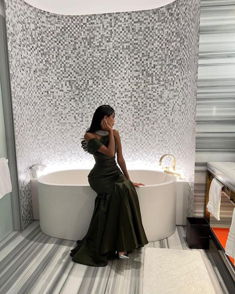 فستان سهرة راقي خامة شانتطون لون زيتي