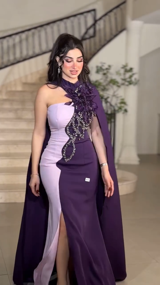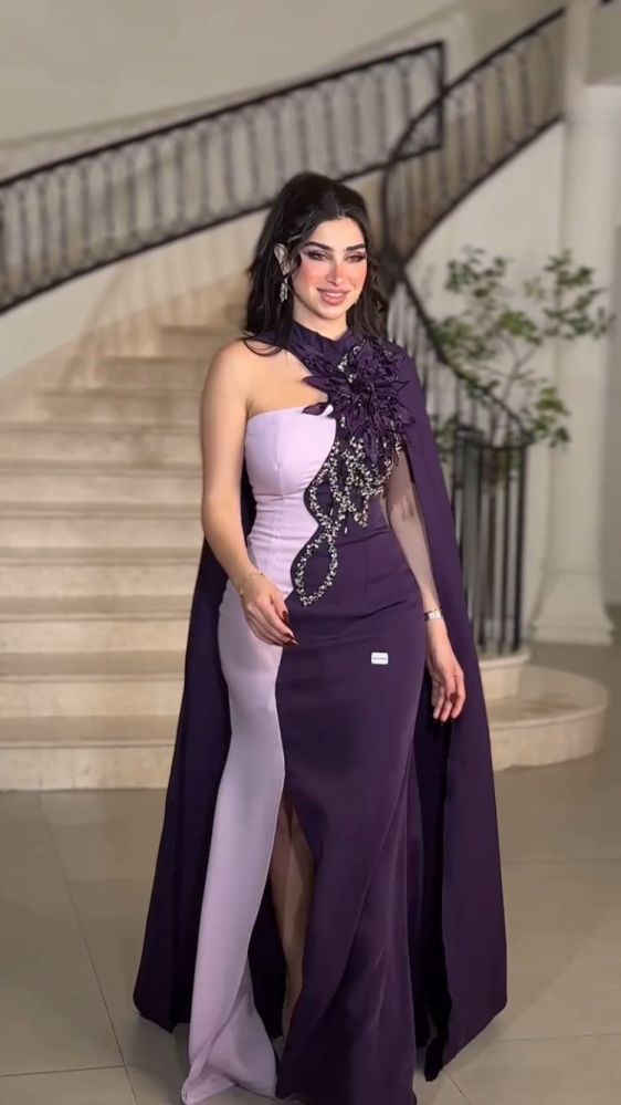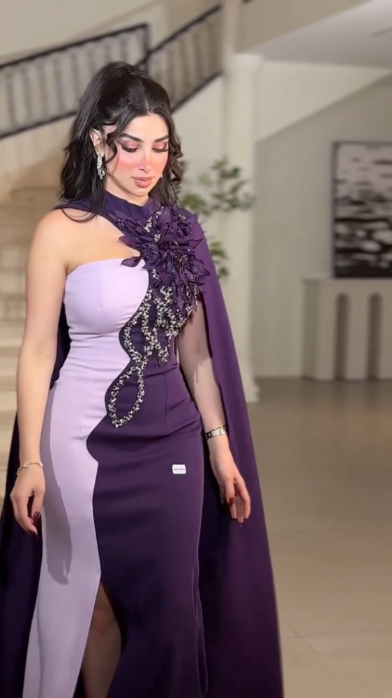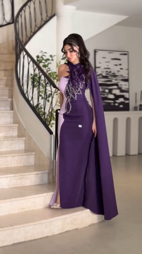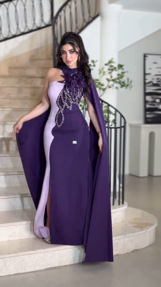 تألقي بإطلالة استثنائية مع فستان السهرة البنفسجي الفاخر بتصميم مميز يجمع بين الأناقة والجرأة. يتميز الفستان بقصّة ضيقة تبرز جمال القوام، مع فتحة جانبية أنيقة تضيف لمسة أنثوية ساحرة الجزء العلوي مزين بتطريز فاخر من الكريستال والترتر اللامع، إلى جانب تفاصيل ورود على الصدر تزيد من فخامته مع الكاب الطويل المنسدل من الكتف فيمنحك حضوراً ملكياً يخطف الأنظار