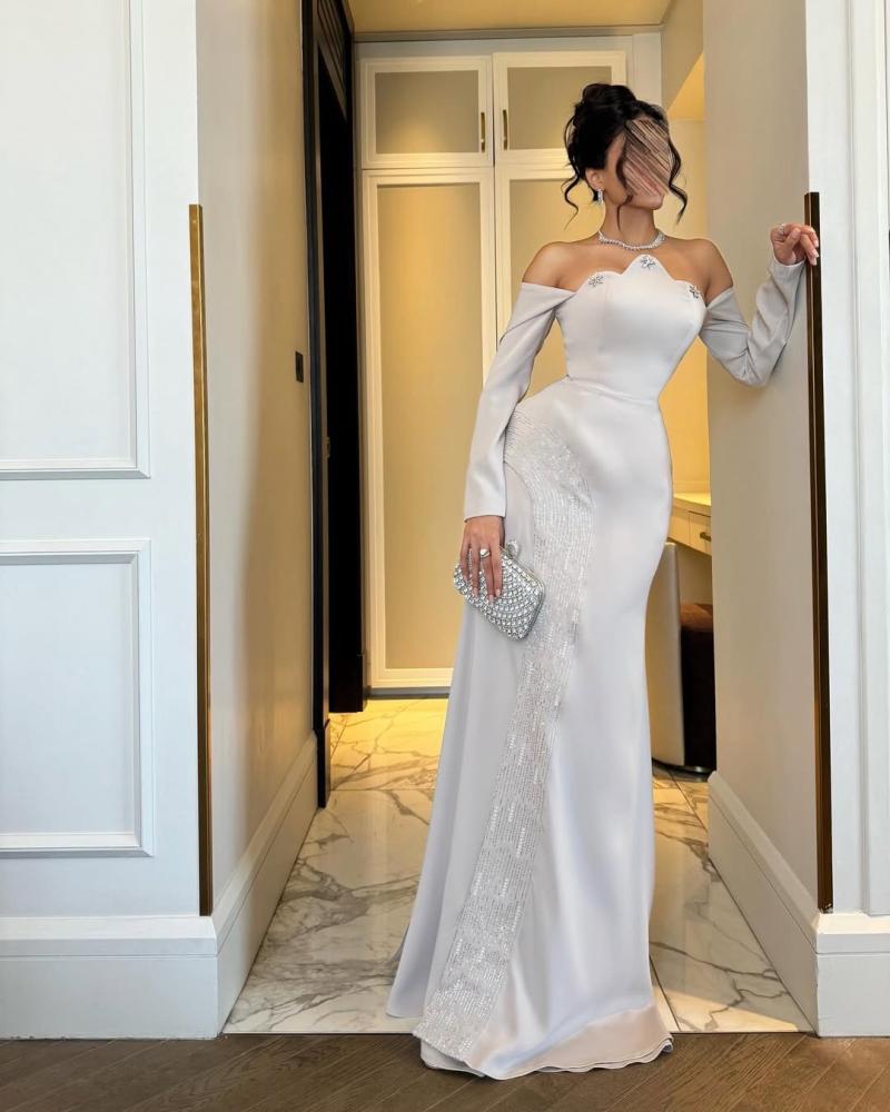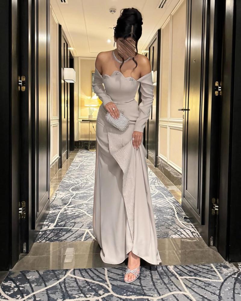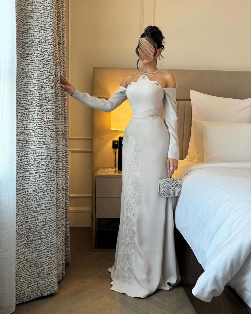 تصميم أنيق بلمسة عصرية، يتميز بقصة أوف شولدر مع حمالة عنق رفيعة لإبراز جمال الكتف والرقبة. مصنوع من خامة فاخرة ناعمة تنسدل بسلاسة، مع تطريز جانبي متدرج يضيف لمسة فخامة وبريق راقٍ.